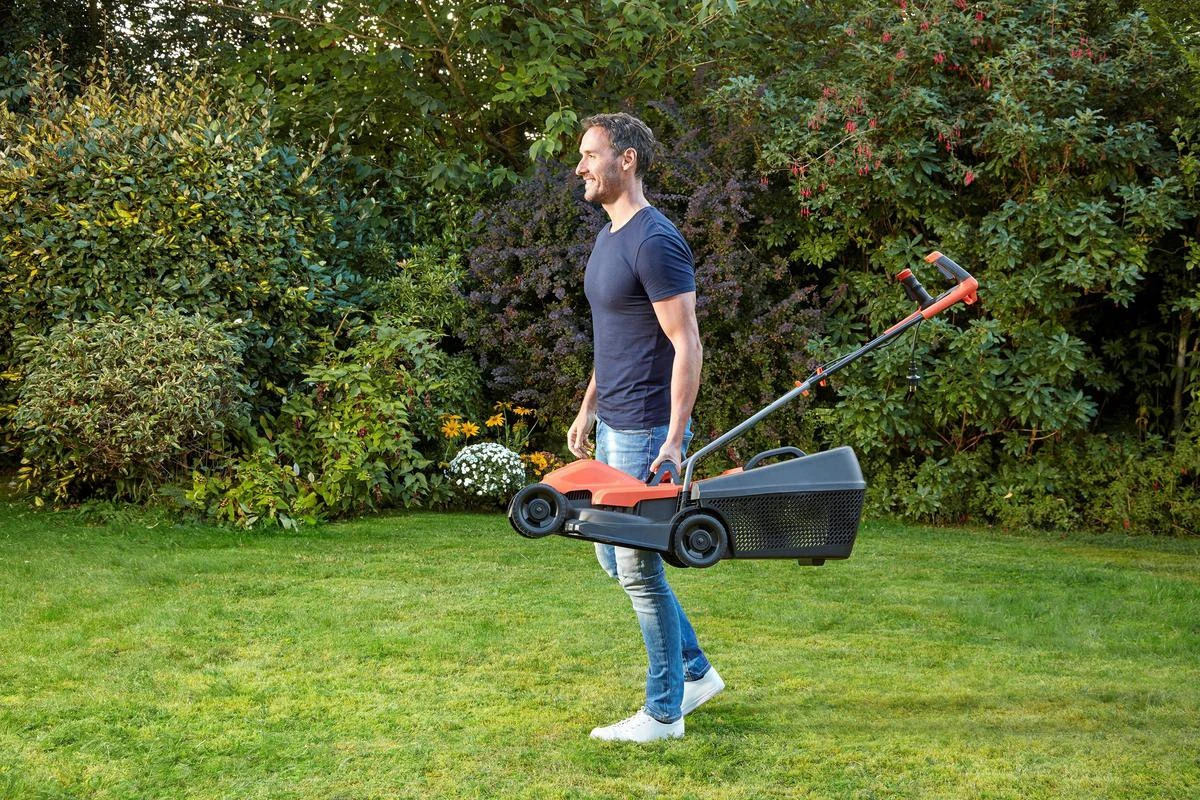 - Son puissant moteur électrique de 1200 W avec une largeur de coupe de 32 cm convient aux petits jardins jusqu’à 300 m².