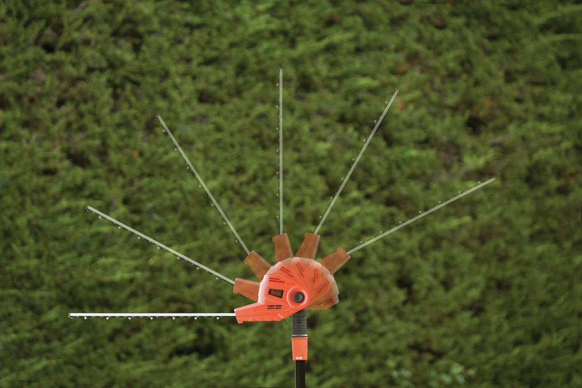 - Pivotement à 180° dans 5 positions différentes – moyen rapide et efficace de tailler les haies hautes